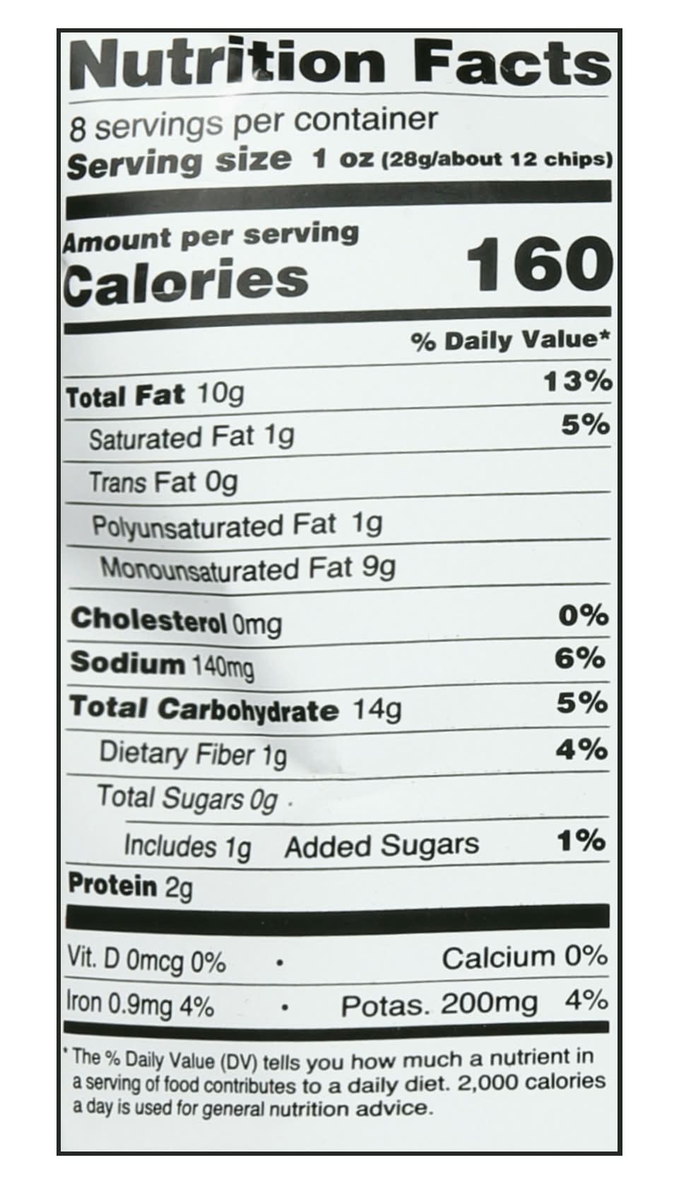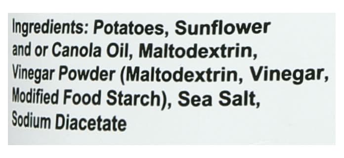 Ingredients: Potatoes, Sunflower and or Canola Oil, Maltodextrin, Vinegar Powder (Maltodextrin, Vinegar, Modified Food Starch), Sea Salt, Sodium Diacetate