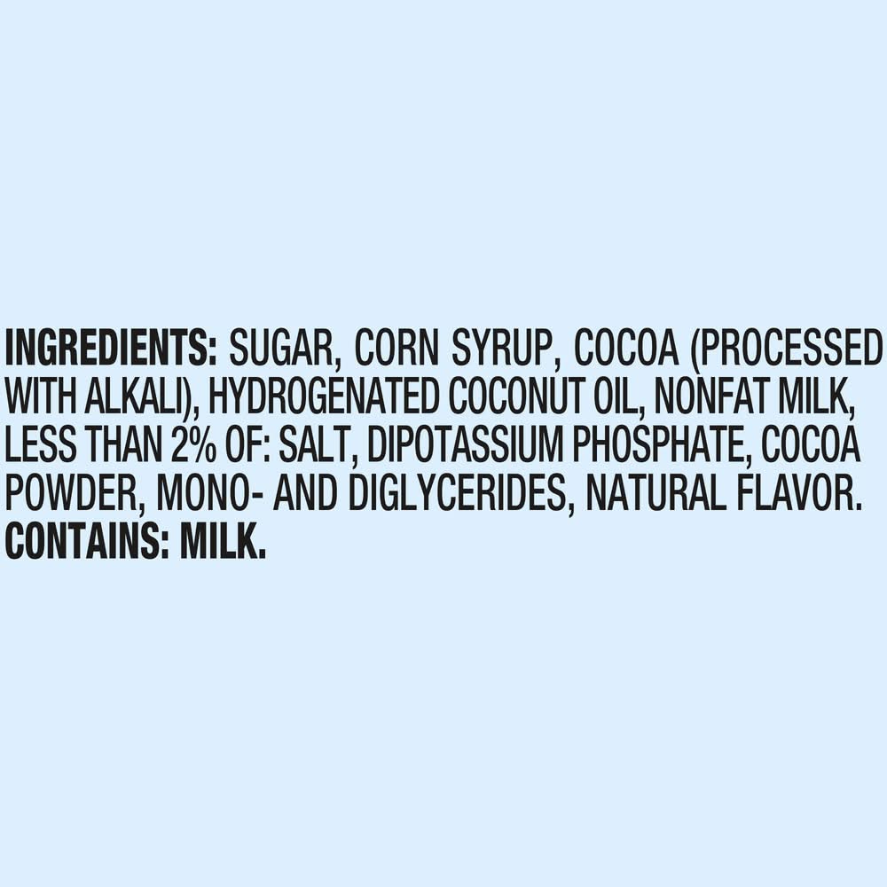 Ingredients: Sugar, Corn Syrup, Cocoa (Processed with Alkali), Hydrogenated Coconut Oil, Nonfat Milk, Less Than 2% Of: Salt, Dipotassium Phosphate, Cocoa Powder, Mono- and Diglycerides, Natural Flavor. CONTAINS: MILK. Contains: Milk