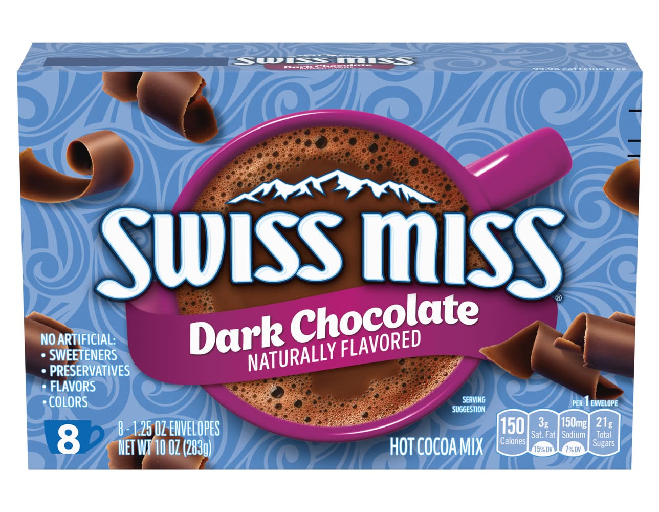 Swiss Miss Dark Chocolate Naturally Flavored Hot Cocoa Mix makes a warm, delightful hot cocoa drink that will bring you comfort and everyday warmth whenever you need it. The dark chocolate flavored hot cocoa drink mix easily transforms into a rich and creamy hot cocoa that delivers on that timeless flavor your family has always known and loved. This Swiss Miss Hot Cocoa Mix is packaged in portioned individual envelopes, making it easy to give everybody the perfect mug of delicious dark chocolate hot cocoa. You won't miss your old hot chocolate. This hot cocoa powder is made with real cocoa and nonfat milk to give you that comforting, rich and creamy taste you expect from Swiss Miss. Not only is this a gluten free hot cocoa, but it's also made with no artificial sweeteners, preservatives, colors or flavors. Preparing a mug of this hot cocoa is easy. Empty the chocolatey cocoa mix into a mug, add 8 ounces of hot water (or milk for a richer taste) and stir. Enjoy a mug as part of your morning routine or as an evening treat. You can use this dark chocolate cocoa mix in different ways. Try making a tasty iced cocoa drink to cool you down, or incorporate the hot cocoa mix into your recipes for brownies, cookies, cakes and more. Whatever you’re warming up to, know that Swiss Miss will give you everything you need in the palm of your hands.