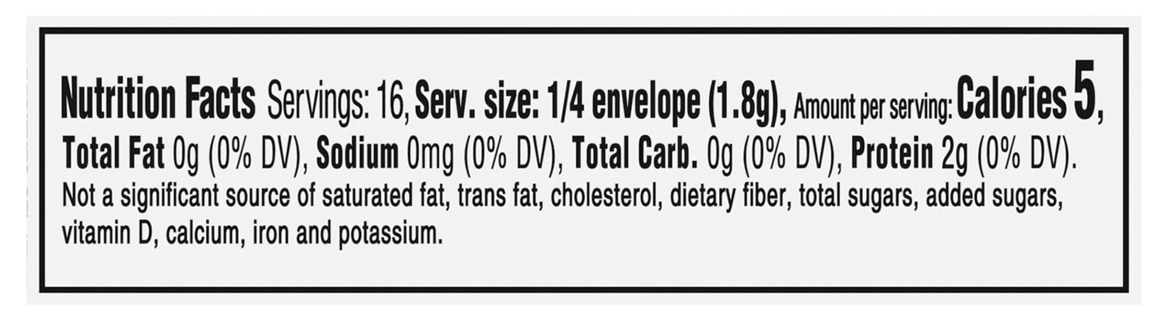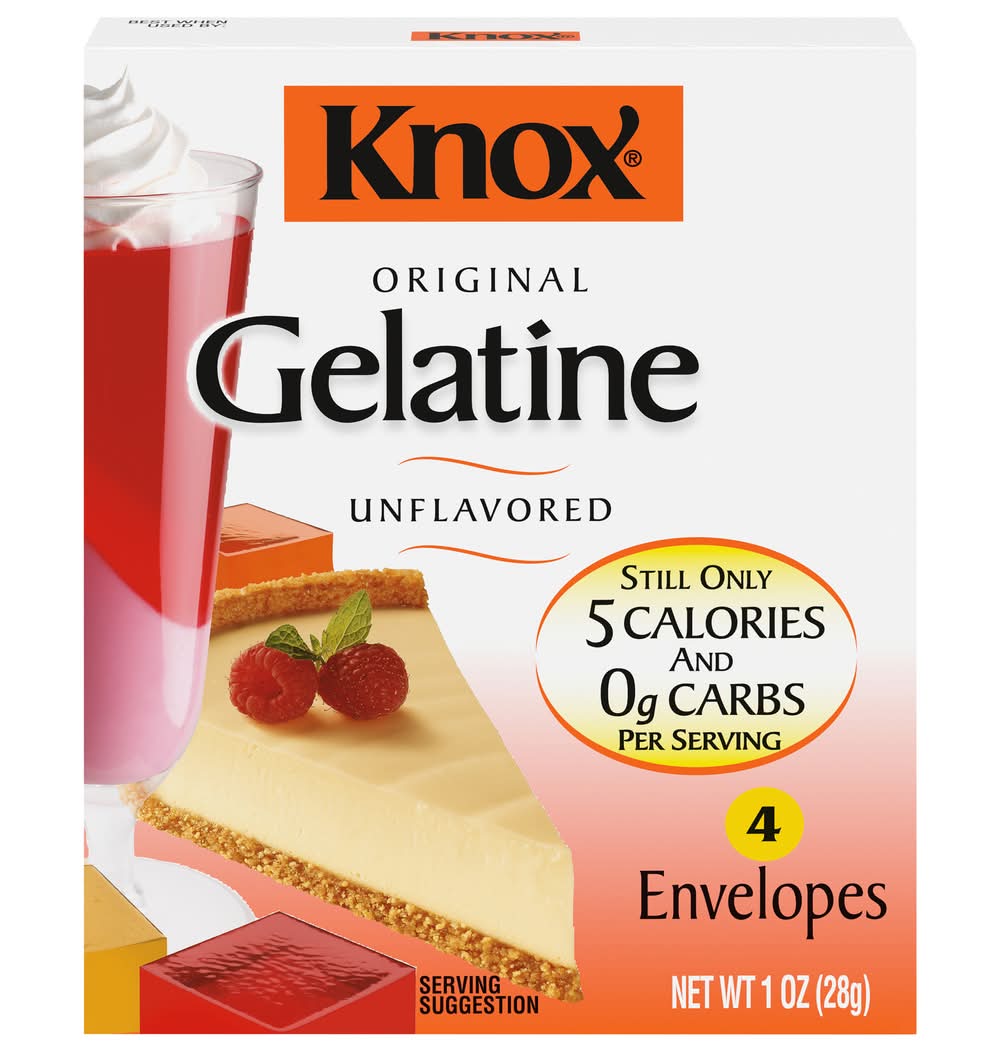 Get creative in the kitchen. Make desserts, salads, jams, jellies, main dishes and more with Knox Original Unflavored Gelatine. The possibilities are endless with our simple and easy-to-use ingredient! Perfect for a wide variety of recipes, our unflavored gelatin contains zero carbs and 5 calories per serving. Our versatile thickener is an essential ingredient in many desserts such as parfaits, cheesecake, panna cotta and homemade marshmallows. You can also use our unflavored gelatin packets to make jam, jelly and fruity gelatin treats. Each box contains four envelopes, individually sealed for lasting freshness until you’re ready to use.