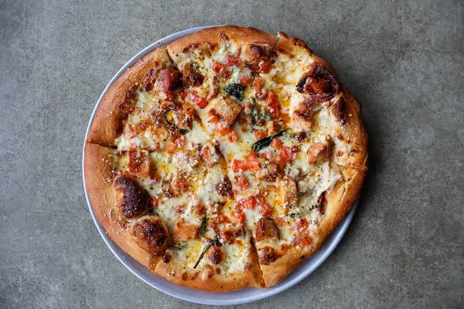 Housemade pesto sauce, aged mozzarella, fire roasted chicken, roasted tomatoes, finished with shaved romano.