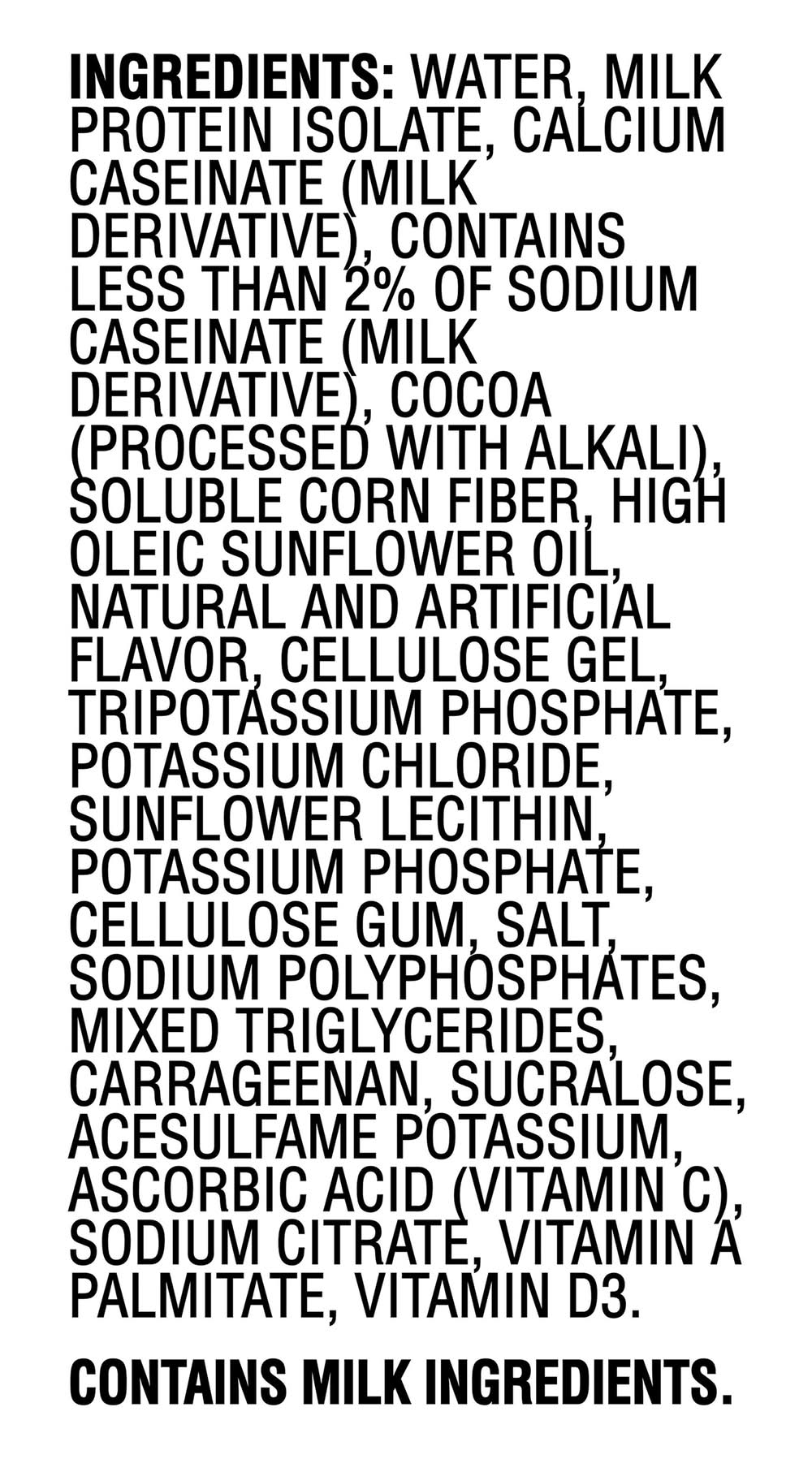 Ingredients: Water, Milk Protein Isolate, Calcium Caseinate (Milk Derivative), Contains Less than 2% of Sodium Caseinate (Milk Derivative), Cocoa (Processed with Alkali), Soluble Corn Fiber, High Oleic Sunflower Oil, Natural and Artificial Flavor, Cellulose Gel, Tripotassium Phosphate, Potassium Chloride, Sunflower Lecithin, Potassium Phosphate, Cellulose Gum, Salt, Sodium Polyphosphates, Mixed Triglycerides, Carrageenan, Sucralose, Acesulfame Potassium, Ascorbic Acid (Vitamin C), Sodium Citrate, Vitamin A Palmitate, Vitamin D3 Contains: Milk