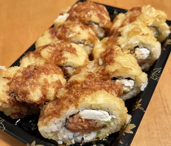 Inside crab meat, cream cheese, and avocado. Outside deep fried, and sauce eel.