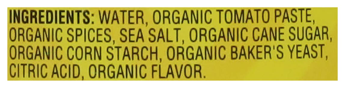 Ingredients: Water, Organic Tomato Paste, Organic Spices, Sea Salt, Organic Cane Sugar, Organic Corn Starch, Organic Baker’s Yeast, Citric Acid, Organic Flavor