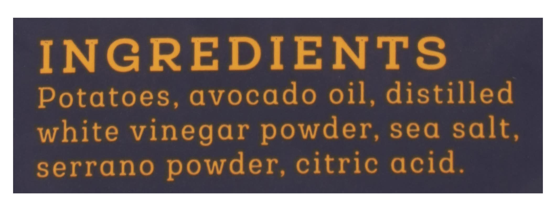 Ingredients: Potatoes, Avocado Oil, Distilled White Vinegar Powder, Sea Salt, Serrano Powder, Citric Acid