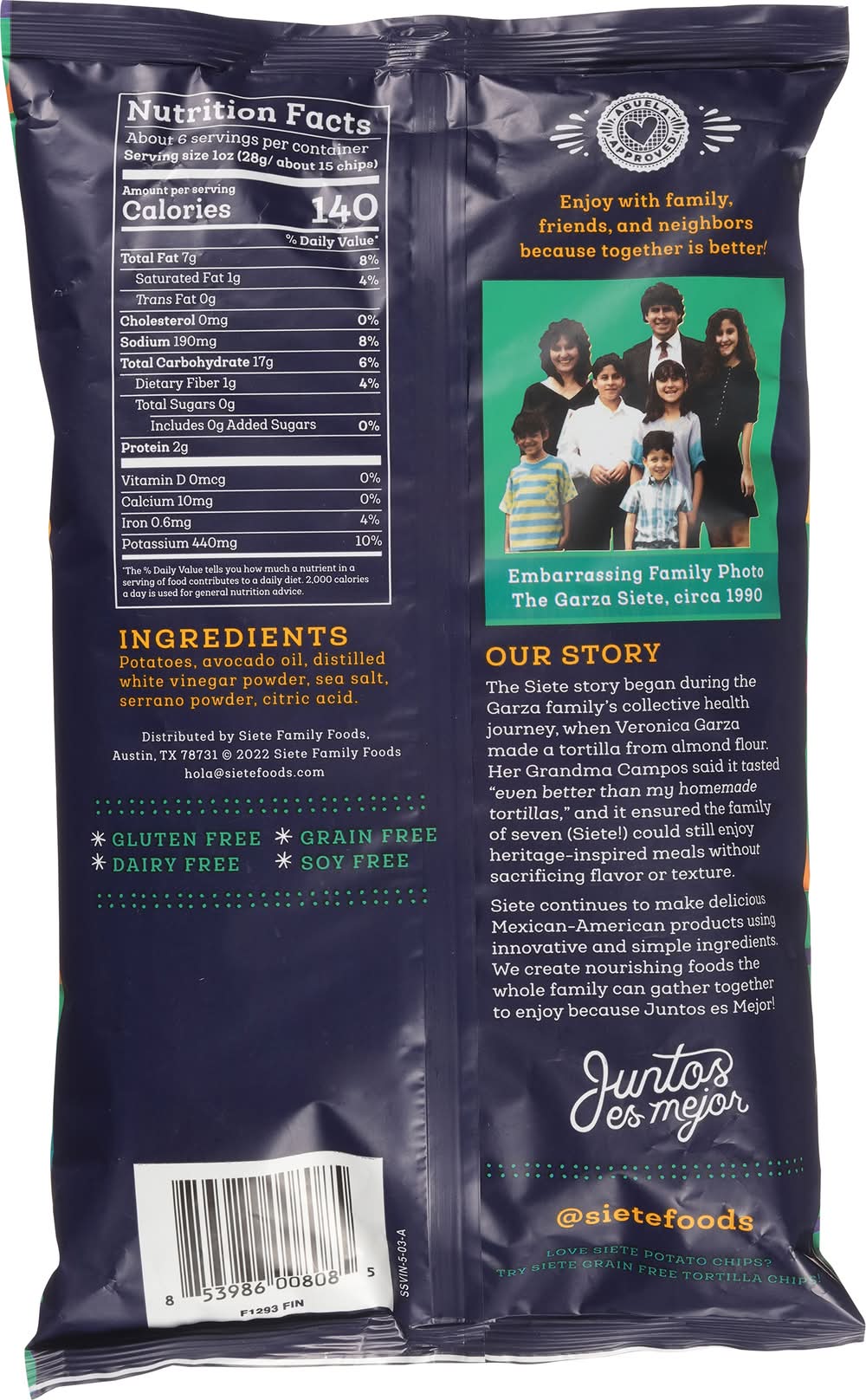 Avocado Oil. Kettle cooked papitas. Hint of serrano. Abuela approved. Enjoy with family, friends, and neighbors because together is better! Embarrassing family photo. Our Story: The Siete story began during the Garza family's collective health journey, when Veronica Garza made a tortilla from almond flour. Her Grandma Campos said it tasted even better than my homemade tortillas, and it ensured the family of seven (Siete!) could still enjoy heritage-inspired meals without sacrificing flavor or texture. Siete continues to make delicious Mexican-American products using innovative and simple ingredients. We create nourishing foods the whole family can gather together to enjoy because Juntos es Mejor! (at)sietefoods. Siete Family Foods, Austin, TX, 78731.