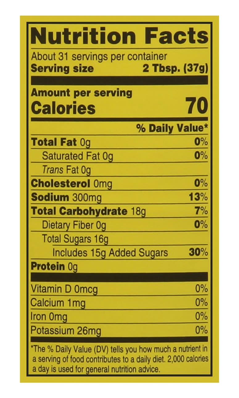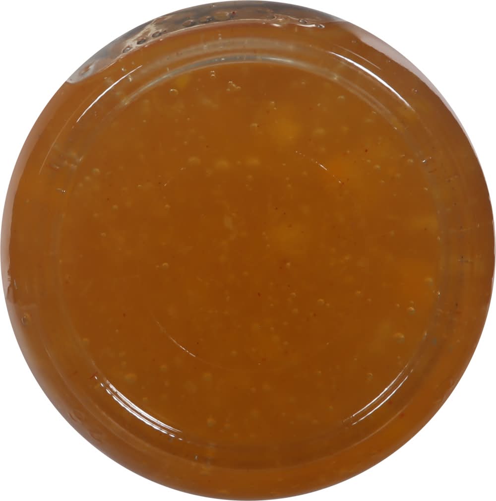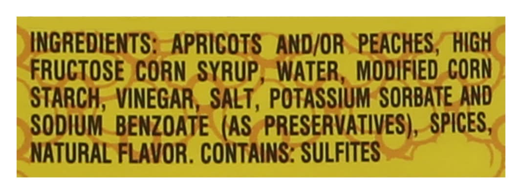 Ingredients: Apricots and/or Peaches, High Fructose Corn Syrup, Water, Modified Corn Starch, Corn Syrup, Water, Modified Corn Starch, Vinegar, Salt, Potassium Sorbate and Sodium Benzoate (as Preservatives), Spices, Natural Flavor Contains: Corn, Sulfites