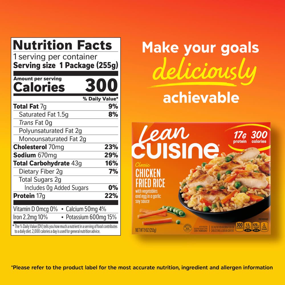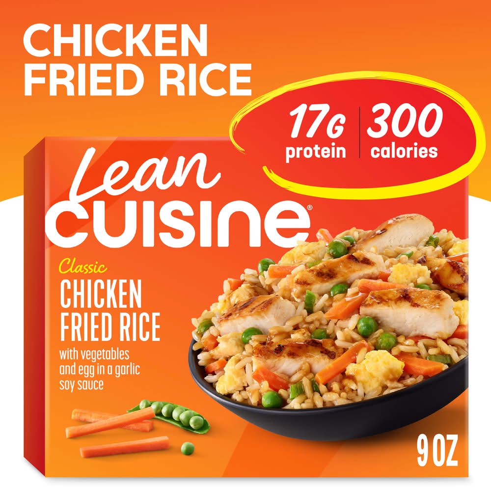 Progress never tasted this good -- Lean Cuisine Chicken Fried Rice is a quick, satisfying option for busy weeknights. This meal features chicken fried rice with vegetables and egg in a garlic soy sauce for real comfort you can feel good about. Whenever you're searching for perfectly portioned meals that fit into your routine, think of Lean Cuisine frozen dinner. Whether you're stocking up on convenient frozen dinners or looking for diet food that fits your meal plan goals, Lean Cuisine makes it easy to stay on track. These chicken fried rice frozen single meals have 17g of protein, making them a great option to help hit your macros. Simply microwave and enjoy — no prep, no cleanup, just smart eating made simple. Nestle USA, Inc., Solon, OH, 44139