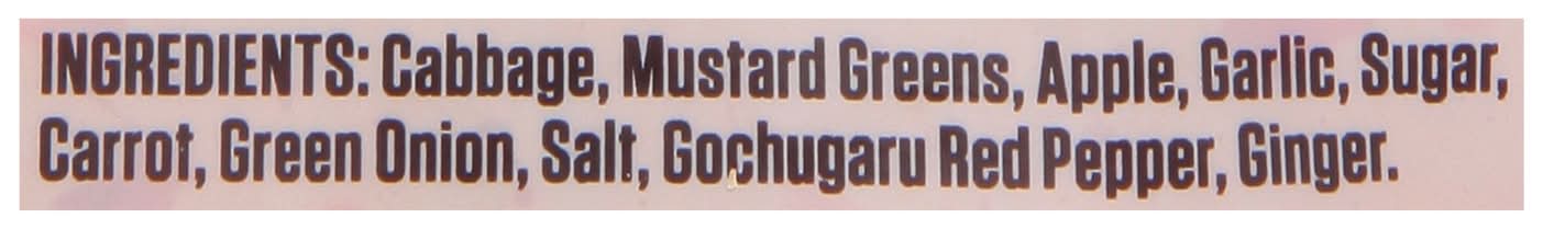 Ingredients: Cabbage, Mustard Greens, Apple, Garlic, Sugar, Carrot, Green Onion, Salt, Gochugaru Red Pepper, Ginger Contains: Mustard