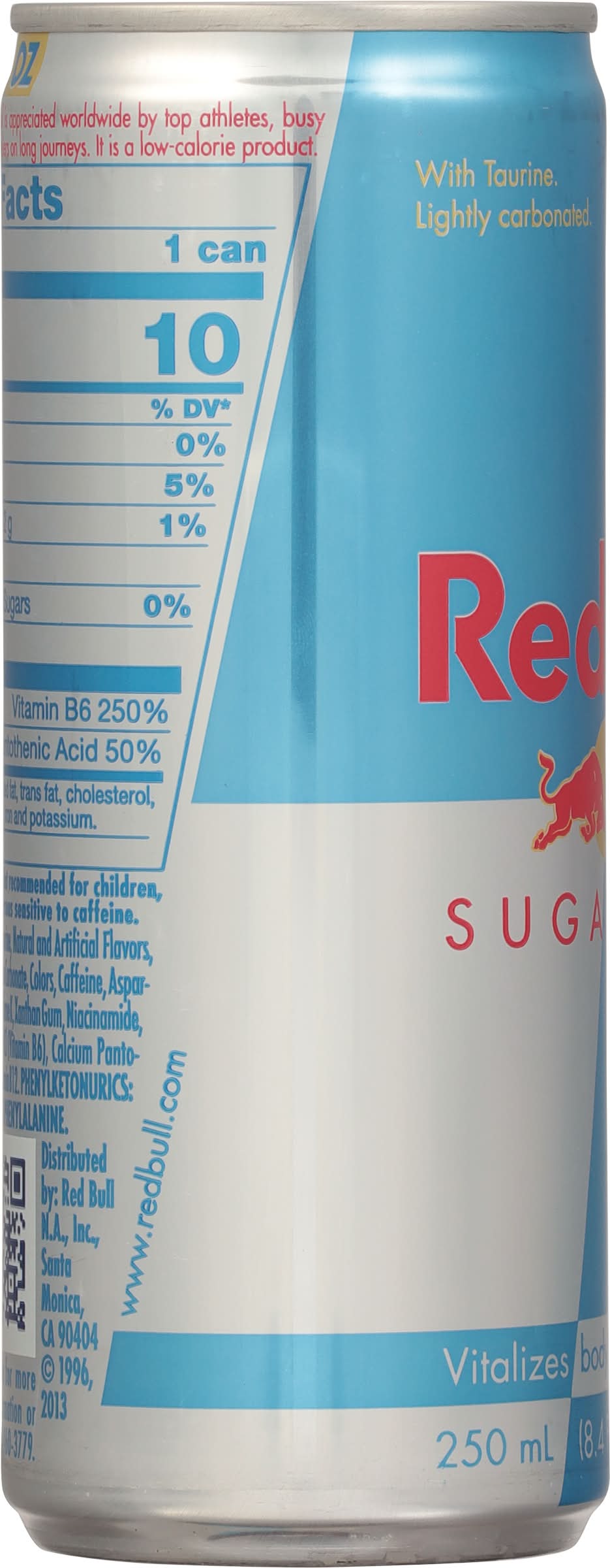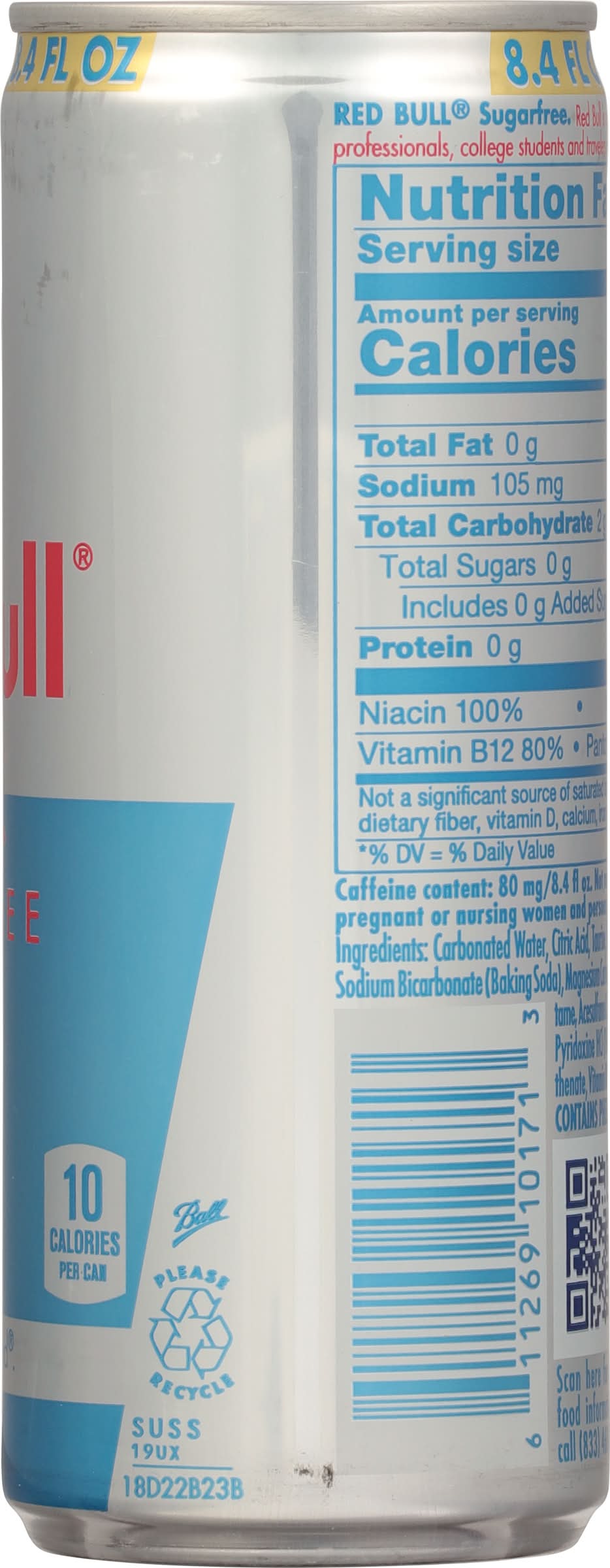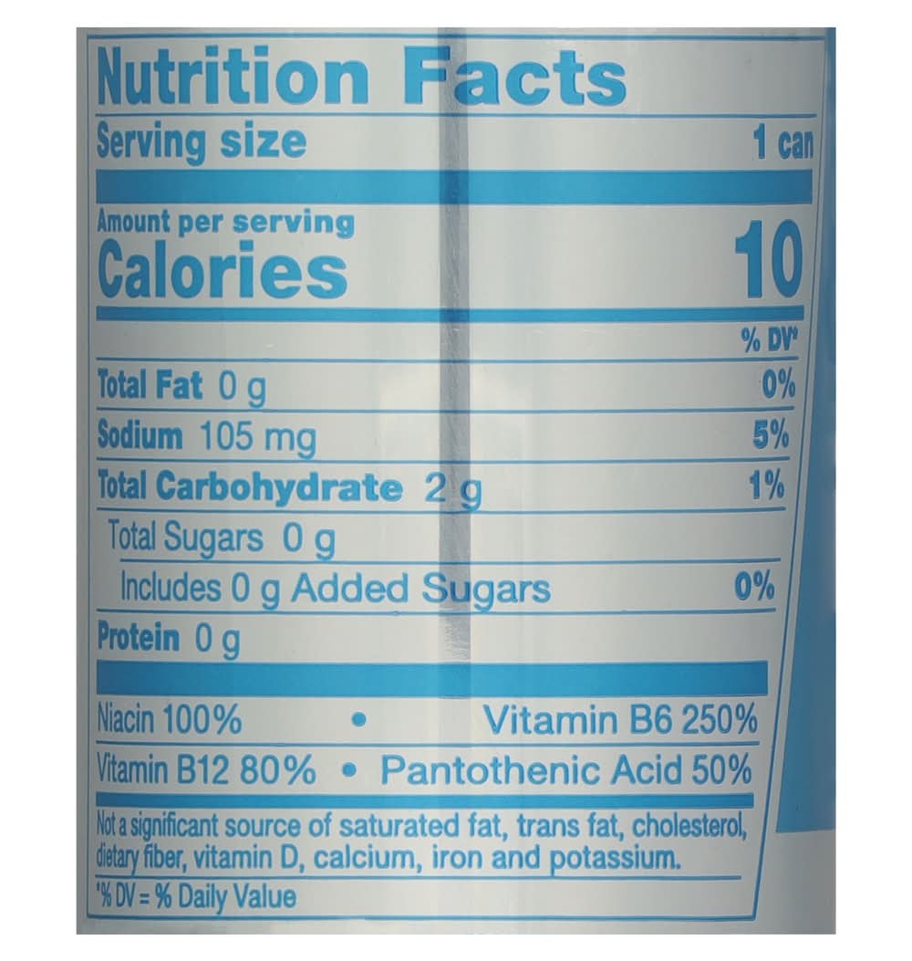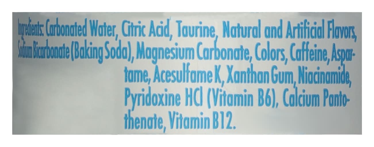 Ingredients: Carbonated Water, Citric Acid, Taurine, Natural and Artificial Flavors, Sodium Bicarbonate (Baking Soda), Magnesium Carbonate, Colors, Caffeine, Aspartame, Acesulfame K, Xanthan Gum, Niacinamide, Pyridoxine HCl (Vitamin B6), Calcium Pantothenate, Vitamin B12 Contains 80mg of caffeine
