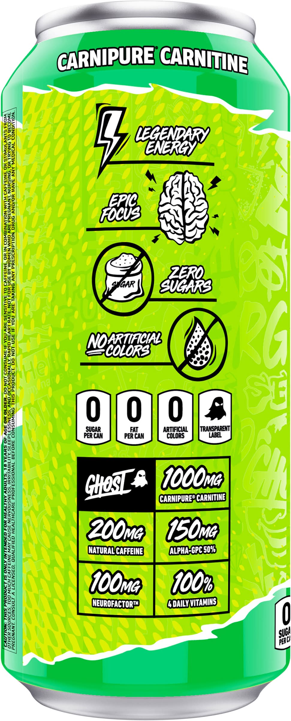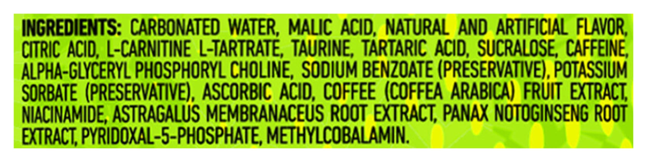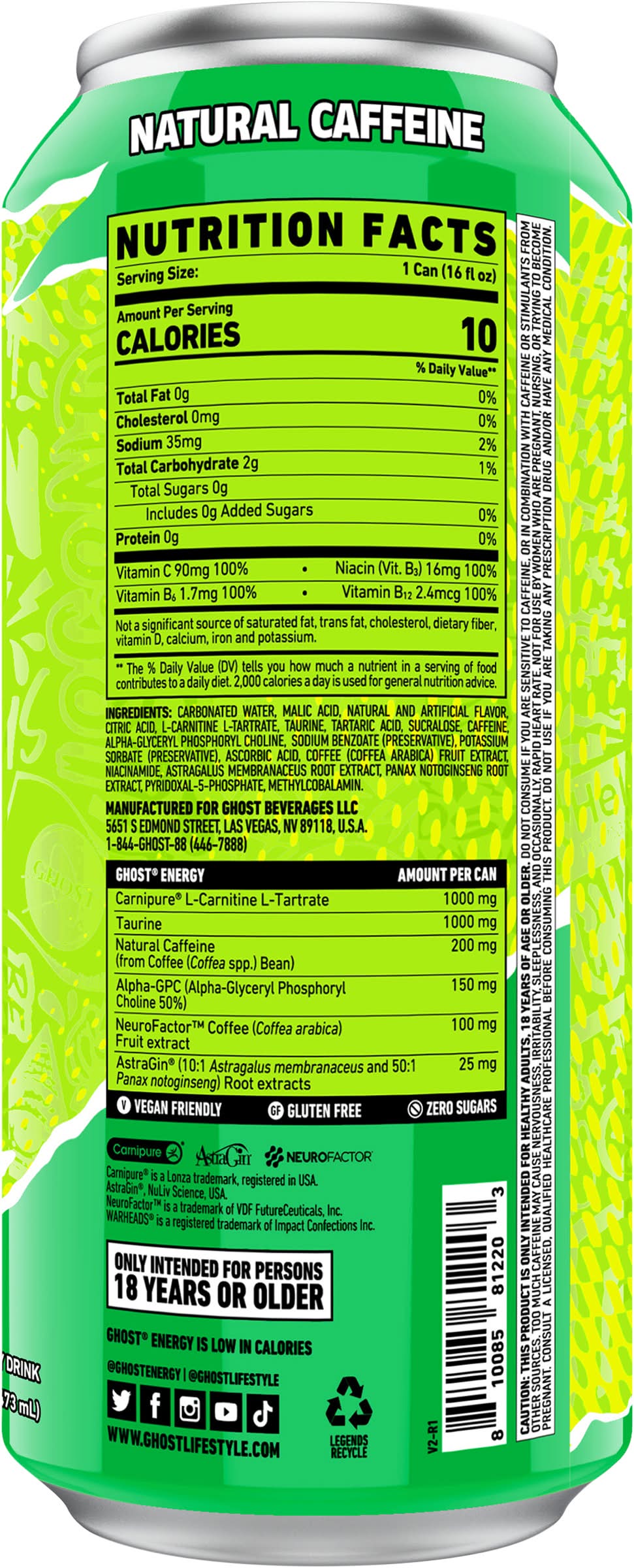 Ingredients: Ghost Energy Carnipure L-Carnitine L-Tartrate, Taurine, Natural Caffeine (from Coffee (Coffea Spp, ) Bean), Alpha-Gpc (Alpha-Glyceryl Phosphoryl Choline 50%), Neurofactor Coffee (Coffea Arabica) Fruit Extract Amount Astragin (10:1 Astragalus Membranaceus and 50:1 Panax Notoginseng) Root Extracts. .Carbonated Water, Malic Acid, Natural and Artificial Flavor, Citric Acid, L-Carnitine L-Tartrate, Taurine, Tartaric Acid, Sucralose, Caffeine, Alpha-Glyceryl Phosphoryl Choline, Sodium Benzoate (Preservative), Potassium Sorbate (Preservative), Ascorbic Acid, Coffee (Coffea Arabica) Fruit Extract, Niacinamide, Astragalus Membranaceus Root Extract, Panax Notoginseng Root Extract, Pyridoxal-5-Phosphate, Methylcobalamin