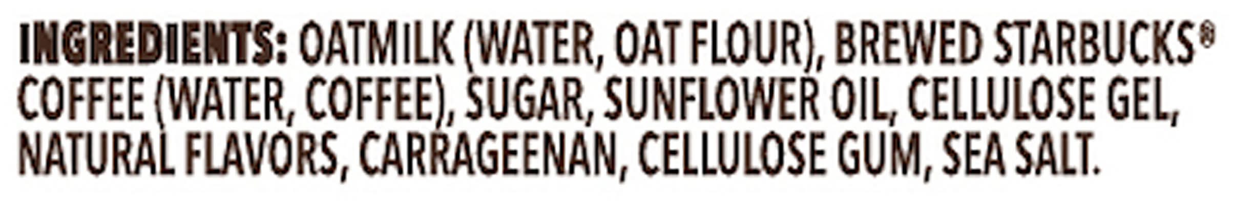 Ingredients: Oatmilk (Water, Oat Flour) Brewed Starbucks Coffee (Water, Coffee), Sugar, Sunflower Oil, Cellulose Gel, Natural Flavors, Carrageenan, Cellulose Gum, Sea Salt Contains: Oat