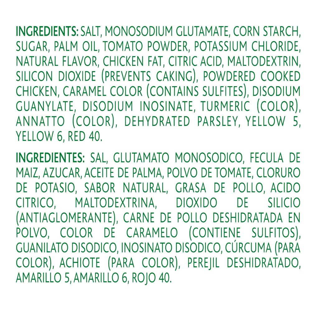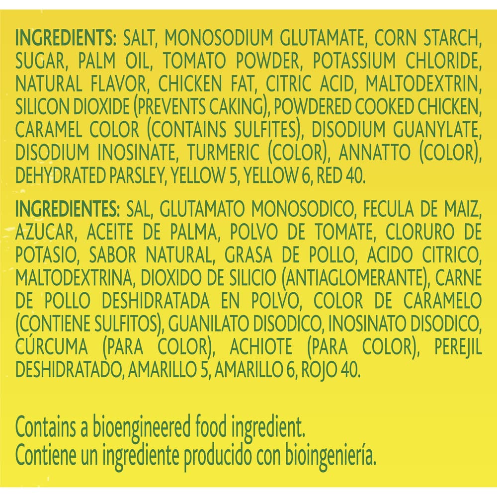 Ingredients: Salt, Monosodium Glutamate, Corn Starch, Sugar, Beef Fat (Adds a Dietarily Insignificant Amount of Fat and Cholesterol), Hydrolyzed Corn Protein, Natural Flavor, Chicken Fat (Adds a Dietarily Insignificant Amount of Fat and Cholesterol), Tomato Powder, Yeast Extract (Barley), Citric Acid, Maltodextrin, Powdered Cooked Chicken (Adds a Dietarily Insignificant Amount of Fat and Cholesterol), Water, Silicon Dioxide (Prevents Caking), Turmeric (Color), Yellow 6 Lake, Dehydrated Parsley, Caramel Color, Disodium Guanylate, Disodium Inosinate, Yellow 6, Annatto (Color), Red 40.