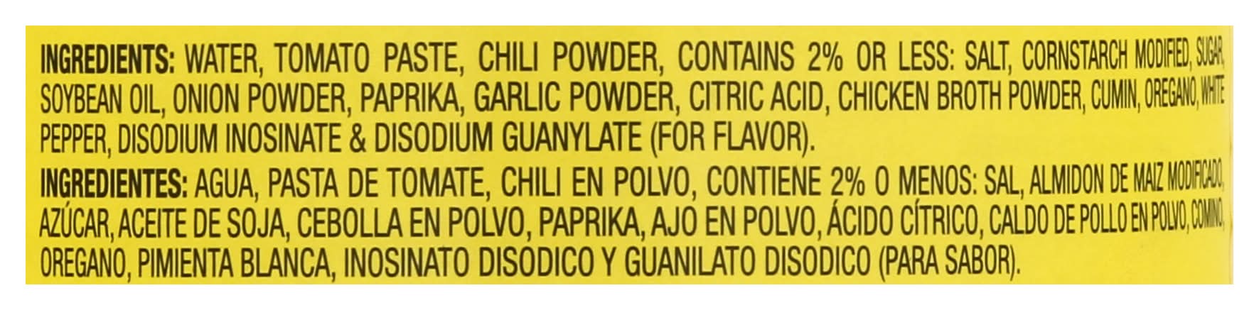 Ingredients: Water, Tomato Paste, Chili Powder, Contains 2% or Less: Salt, Cornstarch Modified, Sugar, Soybean Oil, Onion Powder, Paprika, Garlic Powder, Citric Acid, Chicken Broth Powder, Cumin, Oregano, White Pepper, Disodium Inosinate & Disodium Guanylate (for Flavor). Contains: Soybeans