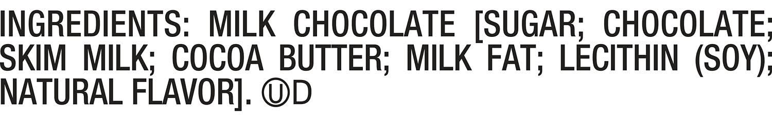 Ingredients: MILK CHOCOLATE [SUGAR; CHOCOLATE; SKIM MILK; COCOA BUTTER; MILK FAT; LECITHIN (SOY); NATURAL FLAVOR] Contains: Contains: Soy|Milk