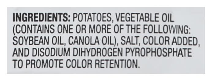 Ingredients: Potatoes, Vegetable Oil (Contains One or More of the Following: Soybean Oil, Canola Oil), Salt, Color Added, and Disodium Dihydrogen Pyrophosphate to Promote Color Retention. Contains: Soy Beans