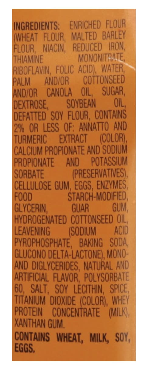 Ingredients: Enriched Flour (Wheat Flour, Malted Barley Flour, Niacin, Reduced Iron, Thiamine Mononitrate, Riboflavin, Folic Acid), Water, Palm and/or Cottonseed and/or Canola Oil, Sugar, Dextrose, Soybean Oil, Defatted Soy Flour, Contains 2% or Less of: Annatto and Turmeric Extract (Color), Calcium Propionate and Sodium Propionate and Potassium Sorbate (Preservatives), Cellulose Gum, Eggs, Enzymes, Food Starch-Modified, Glycerin, Guar Gum, Hydrogenated Cottonseed Oil, Leavening (Sodium Acid Pyrophosphate, Baking Soda, Glucono Delta-Lactone), Mono-and Diglycerides, Natural and Artificial Flavor, Polysorbate 60, Salt, Soy Lecithin, Spice Titaniumdioxide (Color), Whey Protein Concentrate (Milk), Xanthan Gum Contains: Wheat, Milk, Soybeans, Eggs