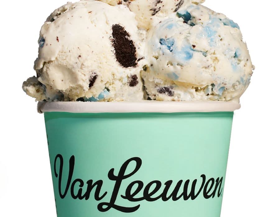 Birthday cake ice cream with dark chocolate cream-filled cookies and swirls of blue frosting. Contains milk, eggs, wheat, coconut.