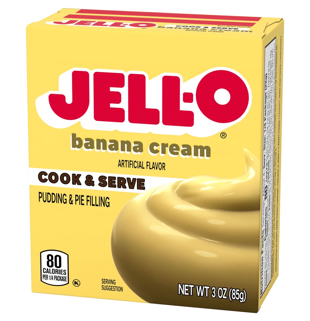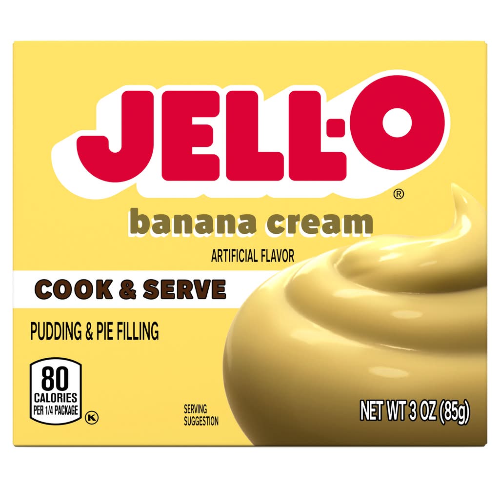 Snack happy. Jell-O Banana Cream Artificially Flavored Cook & Serve Pudding & Pie Filling Mix tastes great whether you enjoy it as a treat or use it as an ingredient in your favorite dessert recipes. Add some wonder to your day with a delicious snack. Fun to make with your kids, our artificially flavored banana cream pudding mix can also be used to create a poke cake, tasty crepes or banana cream pie filling. To prepare, stir mix into 2 cups cold milk in medium saucepan, bring to a boil on medium heat while stirring constantly, then serve warm or chilled. Every Jell-O pudding mix comes packaged in a 3-ounce sealed pouch. Pudding fun in every bite. • Number of servings: 4 • Kraft Heinz Foods Company, Chicago, IL, 60601, Ph: 800-431-1001