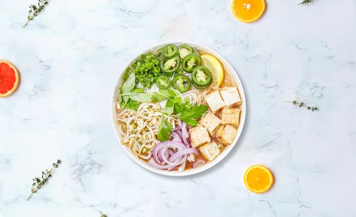 Immerse your taste buds in a warm symphony of deliciously vegan rice noodles, tender tofu, and crunchy vegetables bathed in a soothing broth of natural goodness.