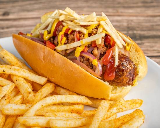 Vegan Hot-Dog, Vegan Chili, Grilled Onions, Pepper, Ketchup, Mustard, Chipotle Sauce, Potato Sticks