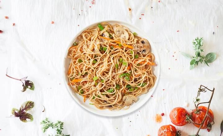 Soft and chewy wheat noodles stir-fried with a savory soy-based sauce, making for a simple yet satisfying vegetarian noodle dish.