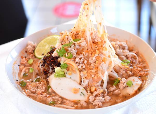 Rice noodles with ground pork, fishcake,