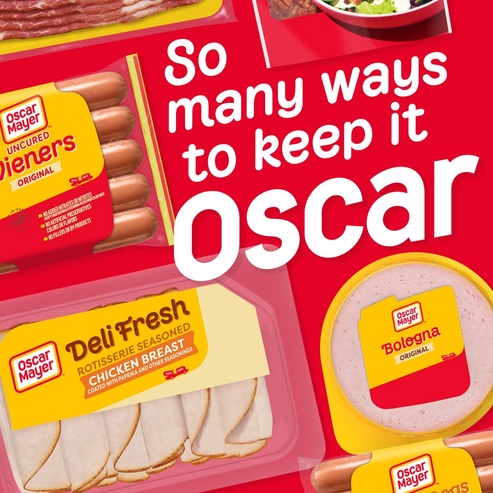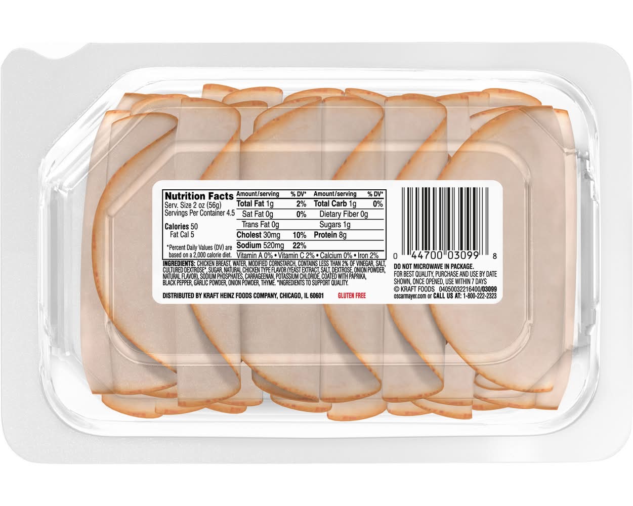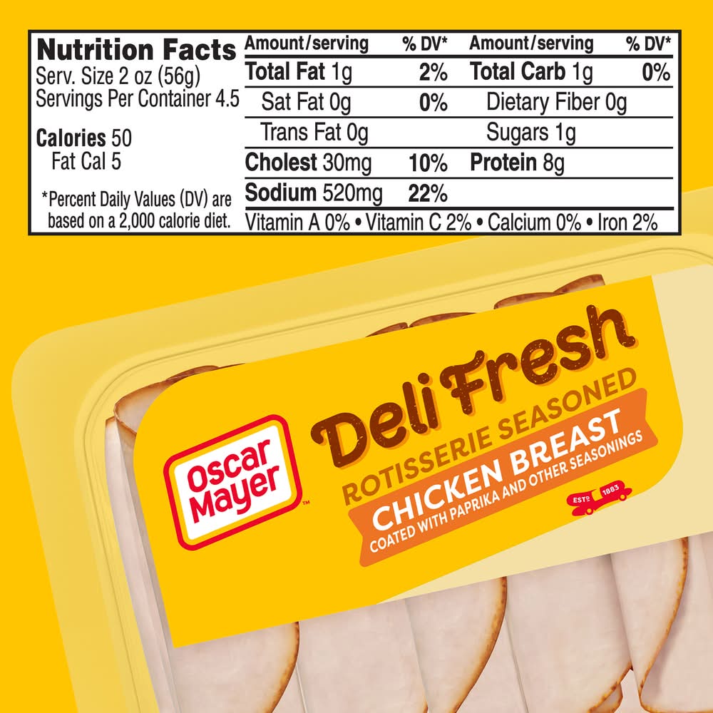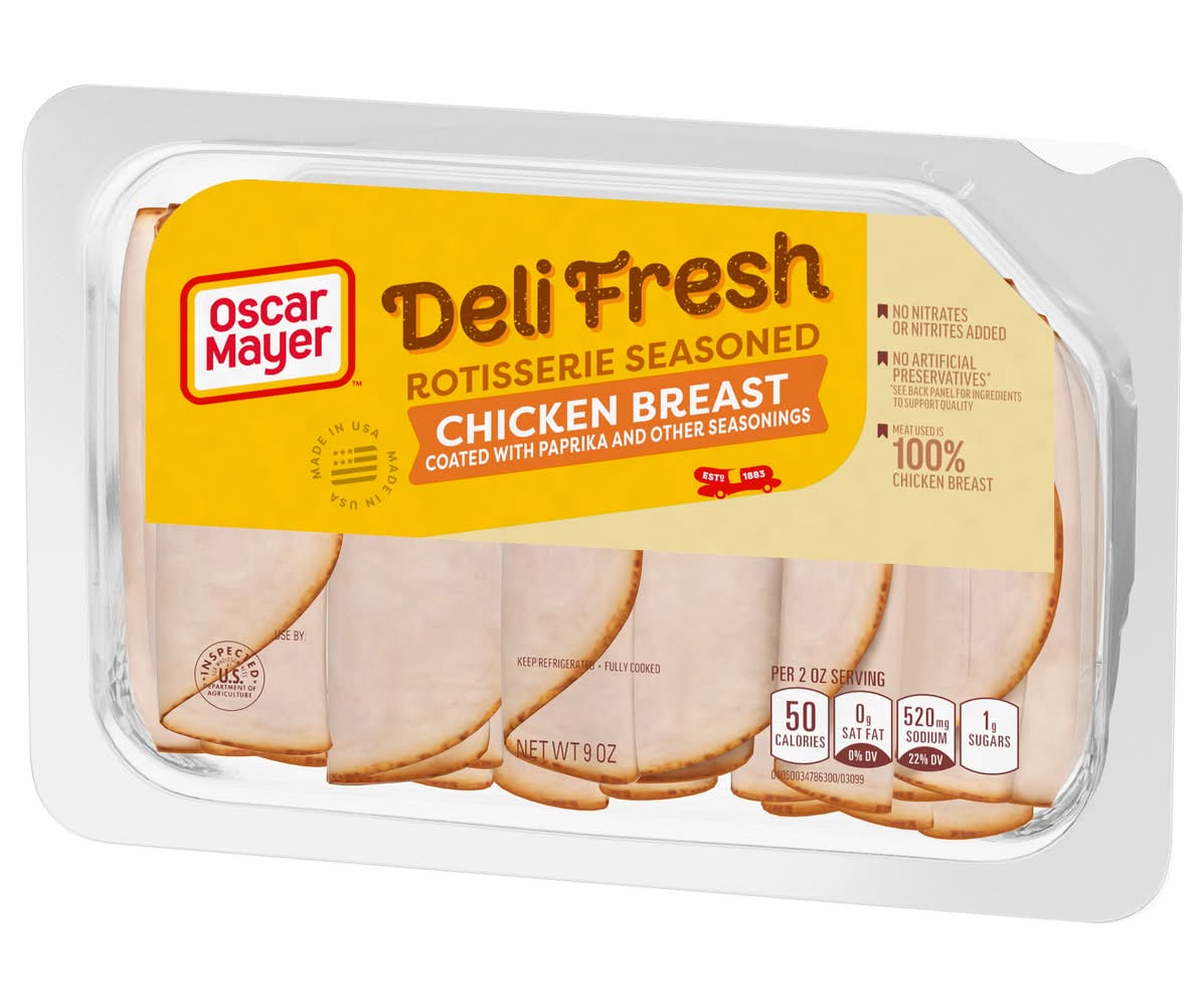 Make a delicious deli sandwich at home with Oscar Mayer Deli Fresh Rotisserie Seasoned Chicken Breast, Coated With Paprika And Other Seasonings. Our quality chicken deli meat is 98% fat-free and made with no artificial preservatives, no added hormones, and no added nitrates or nitrites. Fully cooked and ready to eat, our chicken slices are coated with paprika and other seasonings, making them perfect for a sandwich, salad, or cheese and crackers. Oscar Mayer lunch meat is great for those following a low carb lifestyle. Keep our 9 ounce package of deli chicken refrigerated to maintain freshness. If you enjoy our rotisserie chicken lunch meat, try our honey ham or turkey as well as many other varieties of deli department cold cuts. See back panel for ingredients to support quality. Federal regulations prohibit the use of hormones in poultry. Kraft Heinz Foods Company, Chicago,IL,60601