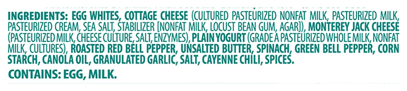 Ingredients: Egg Whites, Cottage Cheese (Cultured Pasteurized Nonfat Milk, Pasteurized Milk, Pasteurized Cream, Sea Salt, Stabilizer [Nonfat Milk, Locust Bean Gum, Agar]), Monterey Jack Cheese (Pasteurized Milk, Cheese Culture, Salt, Enzymes), Plain Yogurt (Grade Á Pasteurized Whole Milk, Nonfat Milk, Cultures), Roasted Red Bell Pepper, Unsalted Butter, Spinach, Green Bell Pepper, Corn Starch, Canola Oil, Granulated Garlic, Salt, Cayenne Chili, Spices Contains: Eggs, Milk, Corn