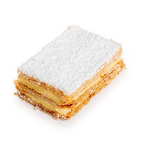 Cuban señorita dessert, sprinkled with powdered sugar over layers of flaky pastry and rich cream filling.
