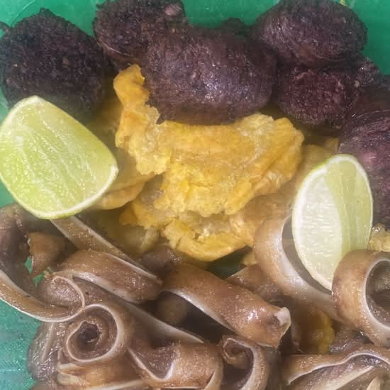 Orejitas de cerdo fritas , Morcilla frita y Tostones
