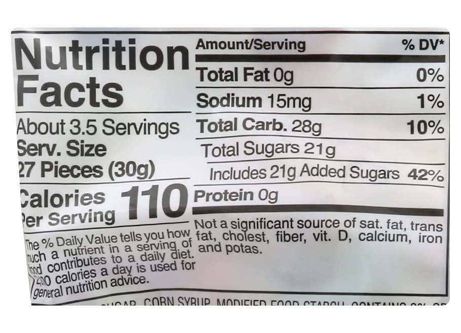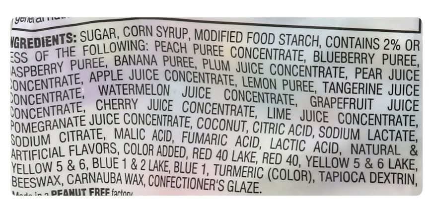 Ingredients: Sugar, Corn Syrup, Modified Food Starch, Contains 2% or Less of the Following: Peach Puree Concentrate, Blueberry Puree, Raspberry Puree, Banana Puree, Plum Juice Concentrate, Pear Juice Concentrate, Apple Juice Concentrate, Lemon Puree, Tangerine Juice Concentrate, Watermelon Juice Concentrate, Grapefruit Juice Concentrate, Cherry Juice Concentrate, Lime Juice Concentrate, Pomegranate Juice Concentrate, Coconut, Citric Acid, Sodium Lactate, Sodium Citrate, Malic Acid, Fumaric Acid, Lactic Acid, Natural & Artificial Flavors, Color Added, Red 40 Lake, Red 40, Yellow 5 & 6 Lake, Yellow 5 & 6, Blue 1 & 2 Lake, Blue 1, Turmeric (Color), Tapioca Dextrin, Beeswax, Carnauba Wax, Confectioner's Glaze Contains: Tree Nuts