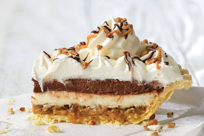 A rich and decadent pie featuring a layer of our classic French Silk, a creamy supreme filling, and a layer of caramel and Texas pecans. Topped with real whipped cream and drizzled with chocolate sauce, caramel and pecans.