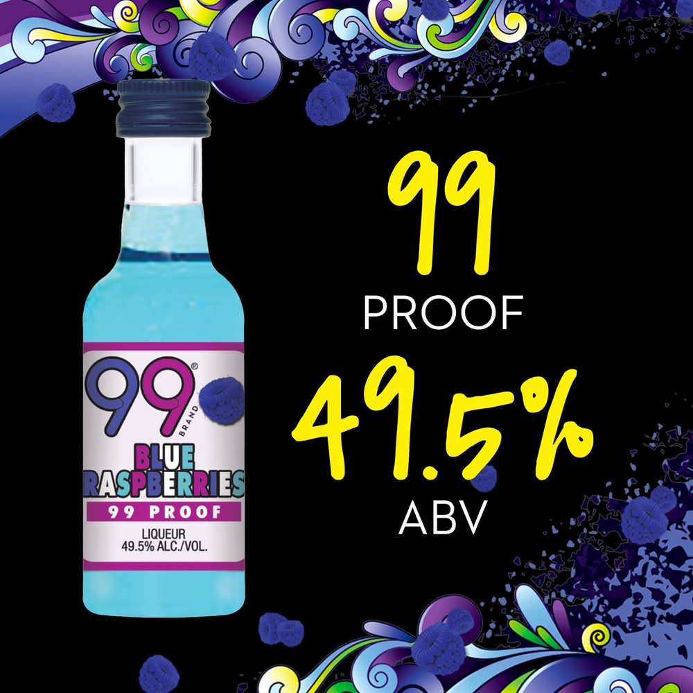 Blue Raspberries Liqueur is a bottle offering a bright tart flavor and a refreshing blue hue. It serves as an ideal choice for those seeking a vibrant shooter experience. • Brand: 99 brand • Flavor: Blue raspberry • Alcohol by volume: 49.5%