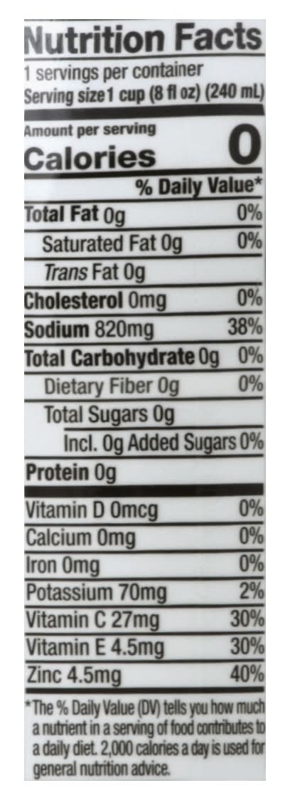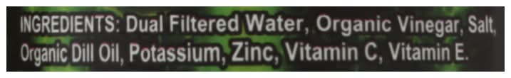 Ingredients: Dual Filtered Water, Organic Vinegar, Salt, Organic Dill Oil, Potassium, Zinc, Vitamin C, Vitamin E