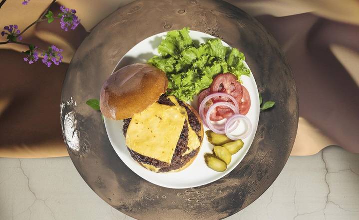 Seasoned plant-based patty topped with melted vegan cheese, lettuce, tomato, onion, and pickles. Served on a warm bun