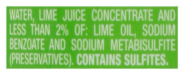 Ingredients: Water, Lime Juice Concentrate and Less than 2% of: Lime Oil, Sodium Benzoate and Sodium Metabisulfite (Preservatives) Contains: Sulphur Dioxide/Sulphites