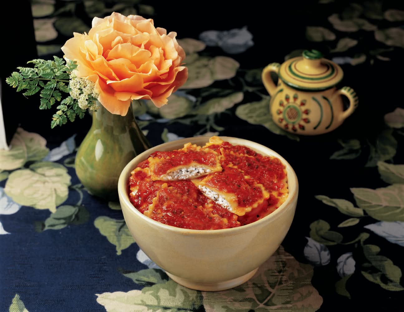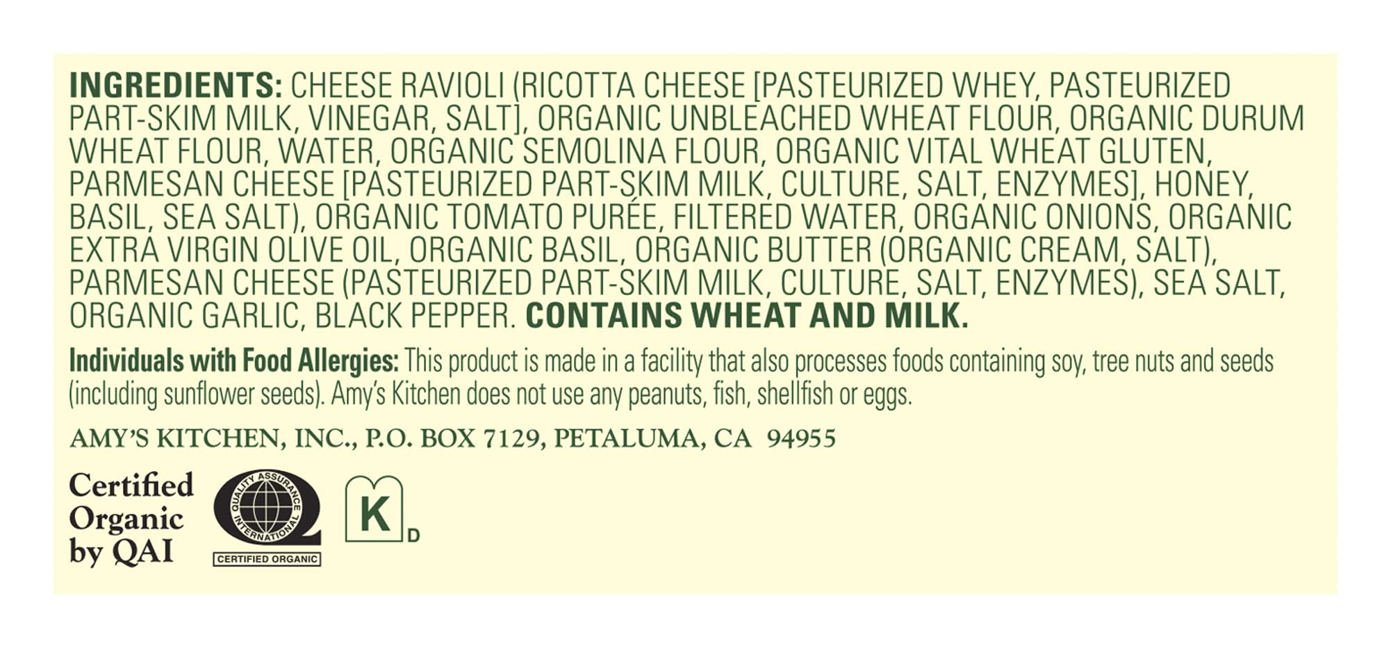 Ingredients: Vinegar, Organic Unbleached Wheat Flour, Organic Durum Wheat Flour, Water, Organic Semolina Flour, Organic Vital Wheat Gluten, Culture, Salt, Honey, Basil, Sea Salt, Filtered Water, Organic Onions, Organic Extra Virgin Olive Oil, Organic Basil, Organic Butter Organic Cream, Salt, Parmesan Cheese Pasteurized Part-Skim Milk, Culture, Salt, Enzymes, Sea Salt, Organic Garlic, Black Pepper., Organic Tomato Purée, Cheese Ravioli Ricotta, Parmesan Cheese Contains: Wheat, Milk, Gluten, Soybeans, Tree Nuts