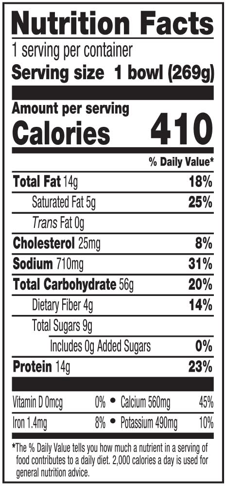 Directions for use: Directions: Ovens may vary. Microwave Oven: Make a 1-inch slit in overwrap. Cook on high for 4-5 minutes. Let sit 1 minute. Serve. Conventional Oven: Preheat oven to 375 degrees F. Remove overwrap. Place bowl on a baking sheet. Bake for 40-45 minutes. Let sit 1 minute. Serve. Toaster Oven: Remove overwrap and bowl. Place in an oven-safe dish. Follow conventional oven directions. Perishable. Keep frozen. Storage recommendation: Keep frozen.