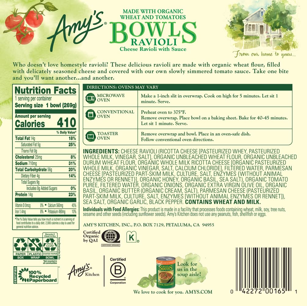 Ravioli Bowl • Amy's Kitchen, Inc., P.O. Box 7129,Petaluma,CA,94955 • Packaging: Reusable