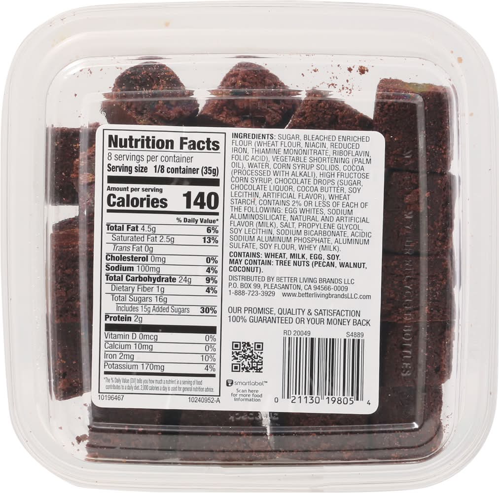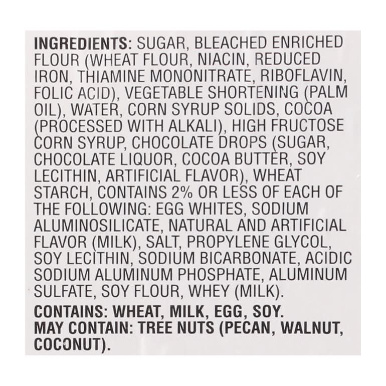 Ingredients: Sugar, Bleached Enriched Flour (Wheat Flour, Niacin, Reduced Iron, Thiamine Mononitrate, Riboflavin, Folic Acid), Vegetable Shortening (Palm Oil), Water, Corn Syrup Solids, Cocoa (Processed with Alkali), High Fructose Corn Syrup, Chocolate Drops (Sugar, Chocolate Liquor, Cocoa Butter, Soy Lecithin, Artificial Flavor), Wheat Starch, Contains 2% or Less of Each of the Following: Egg Whites, Sodium Aluminosilicate, Natural and Artificial Flavor (Milk), Salt, Propylene Glycol, Soy Lecithin, Sodium Bicarbonate, Acidic Sodium Aluminum Phosphate, Aluminum Sulfate, Soy Flour, Whey (Milk). Contains: Wheat, Milk, Eggs, Soybeans, Tree Nuts