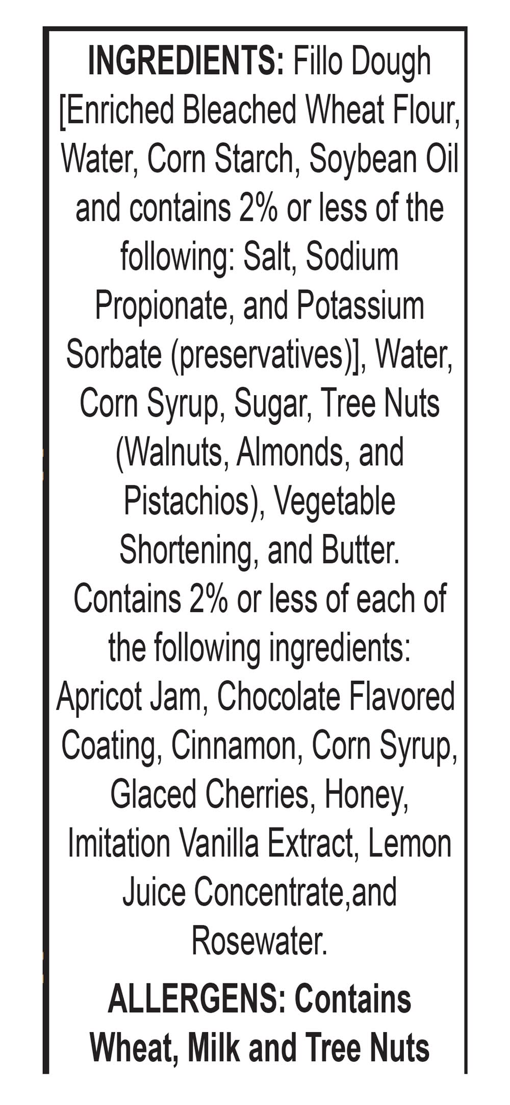 Ingredients: Fillo Dough [Enriched Bleached Wheat Flour, Water, Corn Starch, Soybean Oil and Contains 2% or Less of the Following: Salt, Sodium Propionate, and Potassium Sorbate (Preservatives)], Water, Corn Syrup, Sugar, Tree Nuts (Walnuts, Almonds, and Pistachios), Vegetable Shortening, and Butter, Contains 2% or Less of Each of the Following Ingredients: Apricot Jam, Chocolate Flavored Coating, Cinnamon, Corn Syrup, Glaced Cherries, Honey, Imitation Vanilla Extract, Lemon Juice Concentrate, and Rosewater Contains: Wheat, Milk, Tree Nuts, Soybeans