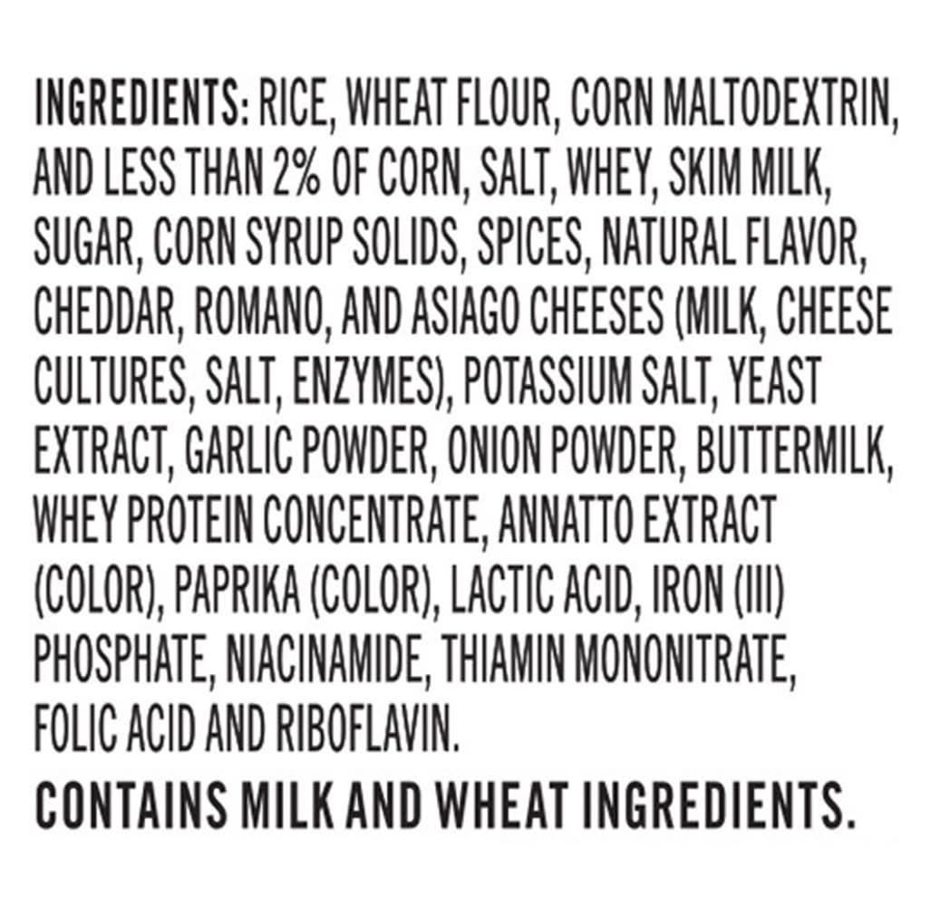 Ingredients: Rice, WHEAT Flour, Corn Maltodextrin, And Less Than 2% Of Corn, Salt, Whey, Skim Milk, Sugar, Corn Syrup Solids, Spices, Natural Flavor, Cheddar, Romano, And Asiago Cheeses (Milk, Cheese Cultures, Salt, Enzymes), Potassium Salt, Yeast Extract, Garlic Powder, Onion Powder, Buttermilk, Whey Protein Concentrate, Annatto Extract (Color), Paprika (Color), Lactic Acid, Iron (Iii), Phosphate, Niacinamide, Thiamin Mononitrate, Folic Acid, And Riboflavin. CONTAINS MILK AND WHEAT INGREDIENTS. Contains: CONTAINS MILK AND WHEAT INGREDIENTS.