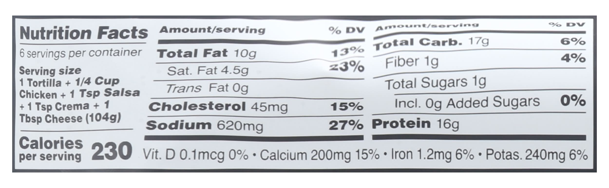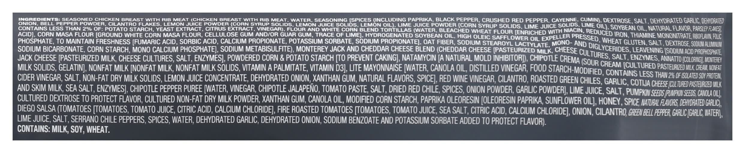 Jack & Cheddar Cheese Blend; Chipotle Crema; Diego Salsa. Ready in 3 mins
