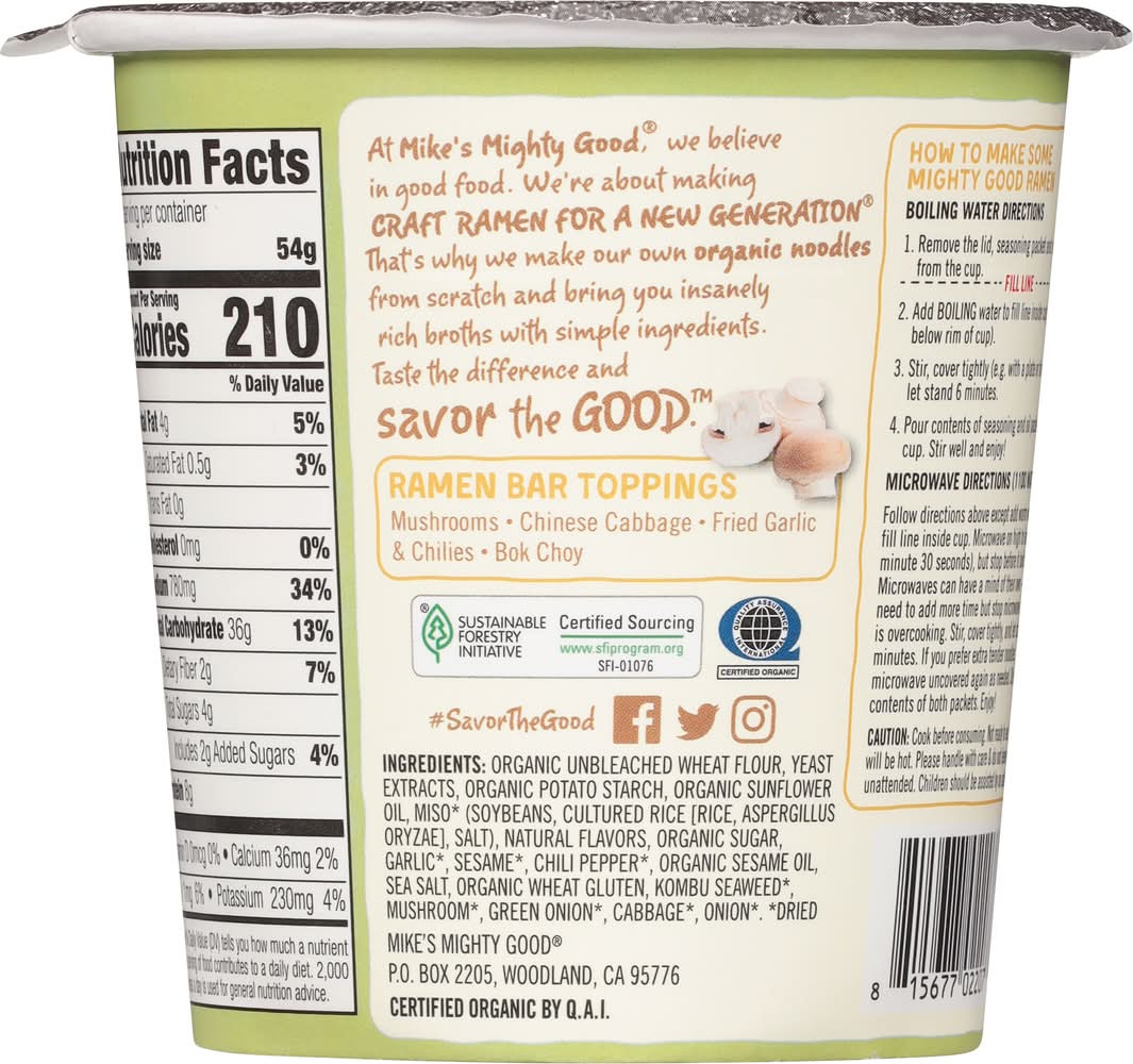 Directions: how to make some mighty good ramen: boiling water directions: 1. remove the lid, seasoning packet and oil packet from the cup. 2. add boiling water to fill line inside cup (about 1 inch below rim of cup). 3. stir, cover tightly (e.g. with a plate or tin foil) and let stand 6 minutes. 4. pour contents of seasoning and oil packets into the cup. stir well and enjoy! microwave directions (1100 watts): follow directions above except add warm water to the fill line inside cup. microwave on high to boil (about 1 minute 30 seconds), but stop before it boils over. microwaves can have a mind of their own - you may need to add more time but stop microwave if product is overcooking. stir, cover tightly, and let stand 6 minutes. if you prefer extra tender noodles, microwave uncovered again as needed. stir in contents of both packets. enjoy! caution: cook before consuming. not ready to eat. cup & food will be hot. please handle with care & do not leave microwave unattended. children should be assisted by an adult. ramen bar toppings: mushrooms. chinese cabbage. fried garlic & chilies. bok choy.