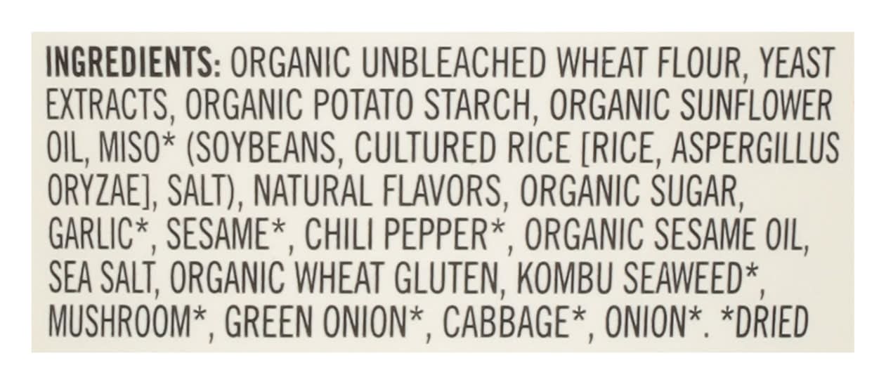Ingredients: Organic Unbleached Wheat Flour, Yeast Extract, Organic Potato Starch, Organic Sunflower Oil, Miso (Dried) (Soybeans, Cultured Rice [Rice, Aspergillus Oryzae], Salt), Natural Flavors, Organic Sugar, Garlic (Dried), Sesame (Dried), Chili Pepper (Dried), Organic Sesame Oil, Sea Salt, Organic Wheat Gluten, Kombu Seaweed (Dried), Mushroom (Dried), Green Onion (Dried), Cabbage (Dried), Onion (Dried) Contains: Wheat, Soybeans, Sesame, Gluten