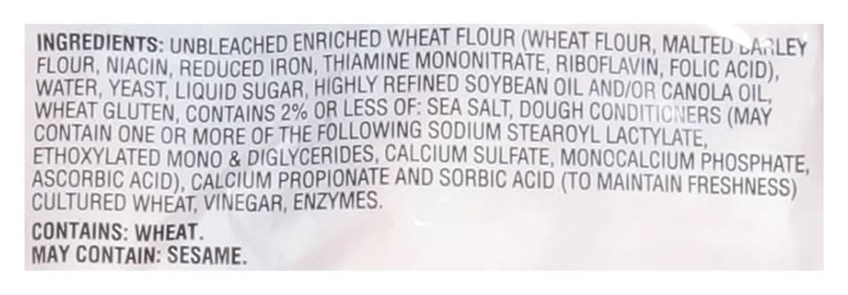 Ingredients: Unbleached Enriched Wheat Flour (Wheat Flour, Malted Carley Flour, Niacin, Reduced Iron, Thiamine Mononitrate, Riboflavin, Folic Acid), Water, Yeast, Liquid Sugar, Highly Refined Soybean Oil and/or Canola Oil Wheat Gluten, Contains 2% or Less of: Sea Salt, Dough Conditioners (May Contain One or More of the Following Sodium Stearoyl Lactylate, Ethoxylated Mono & Diglycerides, Calcium Sulfate, Monocalcium Phosphate, Ascorbic Acid), Calcium Propionate and Sorbic Acid (to Maintain Freshness) Cultured Wheat, Vinegar, Enzymes. Contains: Wheat, Gluten, Soybeans, Sesame