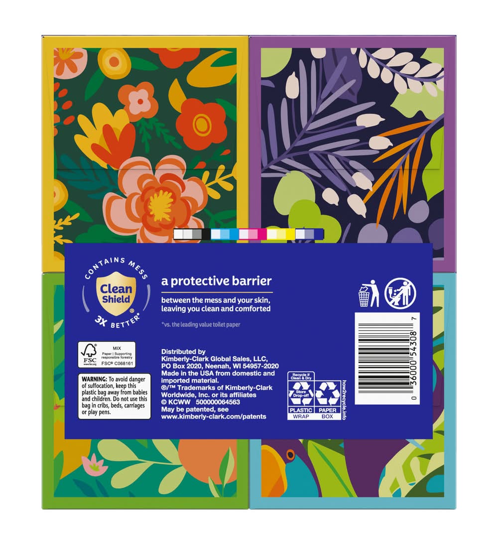 Each 60 3-ply tissues. Softly comforts skin. Paper from responsible sources. • Size: 8.2x8.4 in • Kimberly-clark Global Sales, LLC, PO Box 2020,Neenah,WI,54947-2020 • Packaging: Reusable