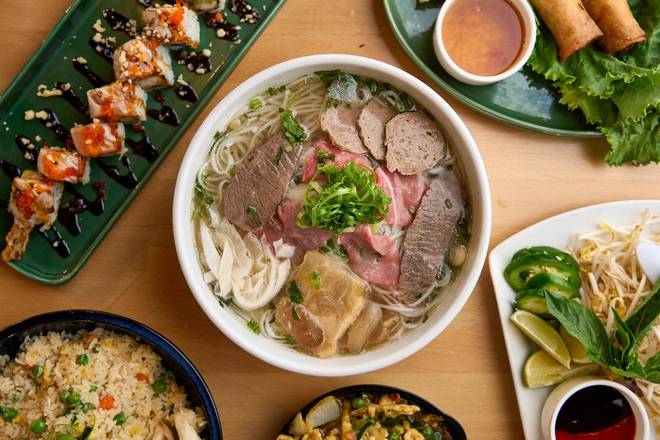Rare eye round steak, brisket, beef meatball, tendon, & beef tripe. Gluten Free