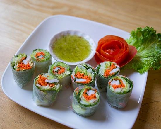 Two pieces. A mixture of vegetables and shrimp wrapped in delicate rice noodles. Served cold with tangy sauce and topped with ground peanuts.
